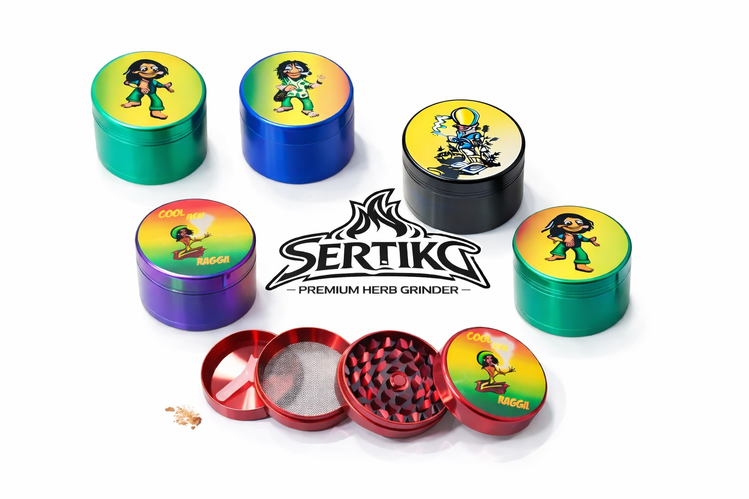 Το grinder 50mm διαθέτει 4 μέρη με φίλτρο pollen και συλλέκτη, καθώς και μαγνητικό καπάκι για σταθερό και ασφαλές κλείσιμο. Τα καπάκια είναι διακοσμημένα με Jamaica & Bob style σχέδια, εμπνευσμένα από τη reggae κουλτούρα, που το κάνουν ιδιαίτερα ελκυστικό για smoke shops και καταστήματα καπνιστικών ειδών.